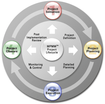 A Project lifecycle is defined as a series of phases undertaken to deliver a required project outcome. The Method123 Project Management Lifecycle (MPMM) consists of four phases, as depicted by the diagram to the left of this paragraph.